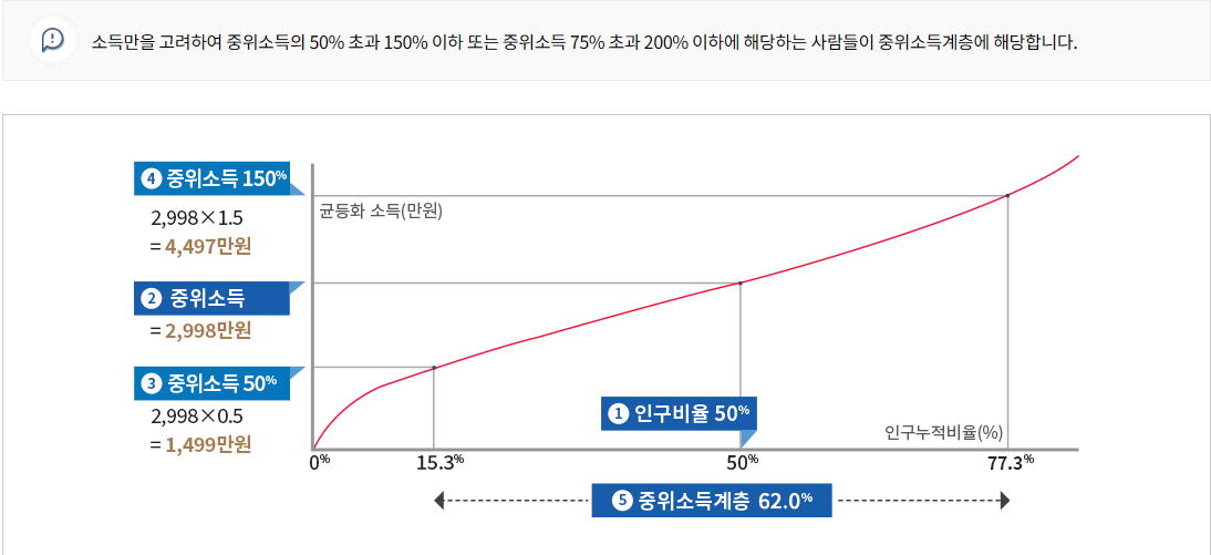 중위소득은 모든 가구의 소득을 크기순으로 나열했을 때, 정중앙에 위치한 가구의 소득을 의미합니다.